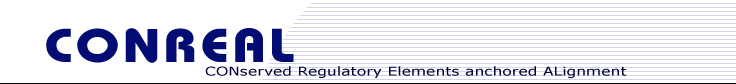 CONREAL ALIGNED HITS| Matrix | Identity | Seq1 from | Seq1 to | Seq2 from | Seq2 to | Strand | Score1 | Score2 | Rel.Score1 | Rel.Score2 | Factor | Found by: C = CONREAL L = LAGAN M = MAVID B = BLASTZ